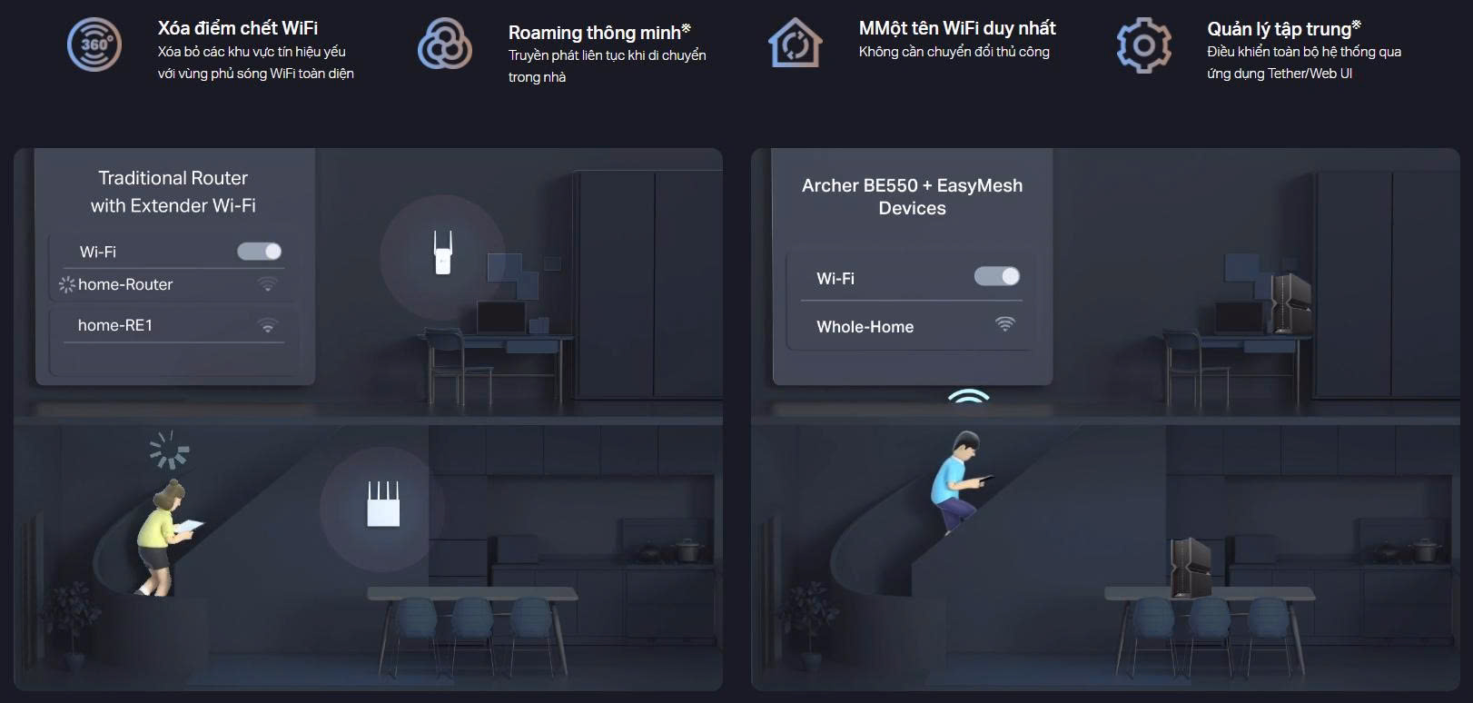 - Tương thích EasyMesh: Hoạt động với các router và bộ mở rộng EasyMesh để tạo nên mạng Mesh WiFi toàn diện cho ngôi nhà, loại bỏ tình trạng rớt mạng và lag khi di chuyển giữa các tín hiệu.