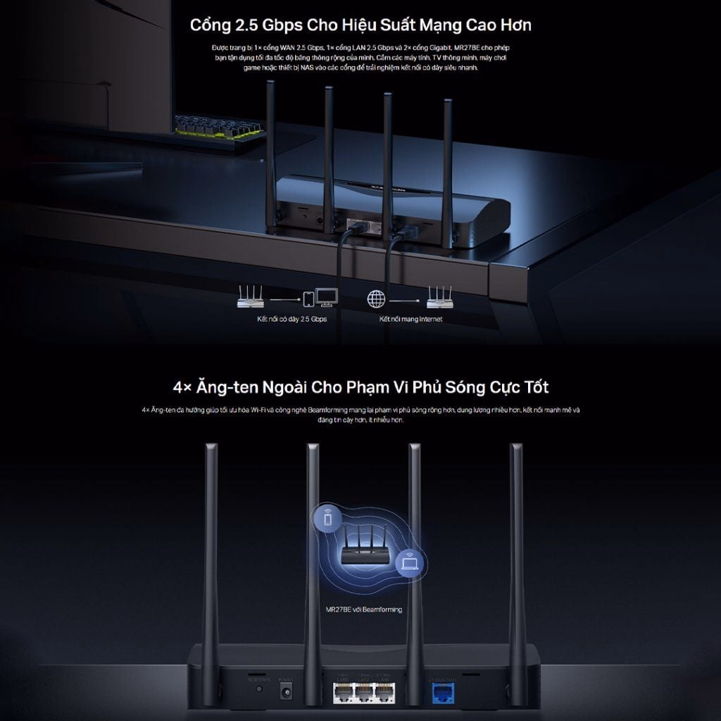 Ứng dụng các công nghệ tiên tiến của Wi-Fi 7 như kênh 160 MHz, 4K-QAM và Multi-Link Operation (MLO), MR27BE mang lại khả năng truyền dữ liệu nhanh hơn, độ trễ thấp hơn và hiệu quả kết nối cao hơn đáng kể so với các chuẩn Wi-Fi trước đây.