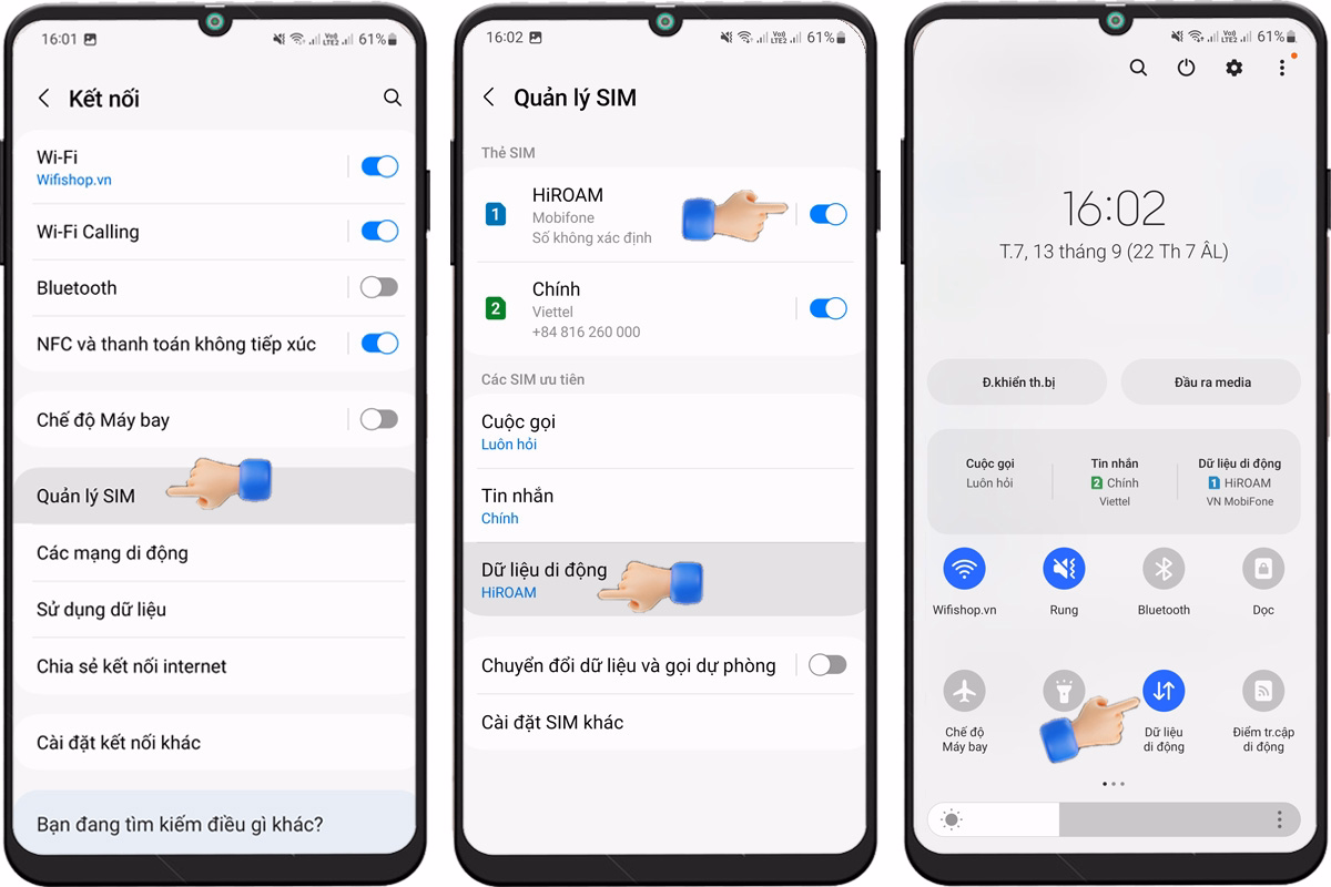 Lắp SIM vào điện thoại → Vào Cài đặt → Kết nối → Quản lý SIM → bật Chuyển vùng dữ liệu để sử dụng. Nếu 2 SIM vào Quản lý SIM → ( bật SIM HiROAM, hoặc sim Chính, Danh Nghiệp tùy bạn đặt tên) → Chọn Dữ liệu Di Động → Chọn SIM HIROAM là sim chính sử dụng dữ liệu. Bật Dữ liệu di dộng để sử dụng.